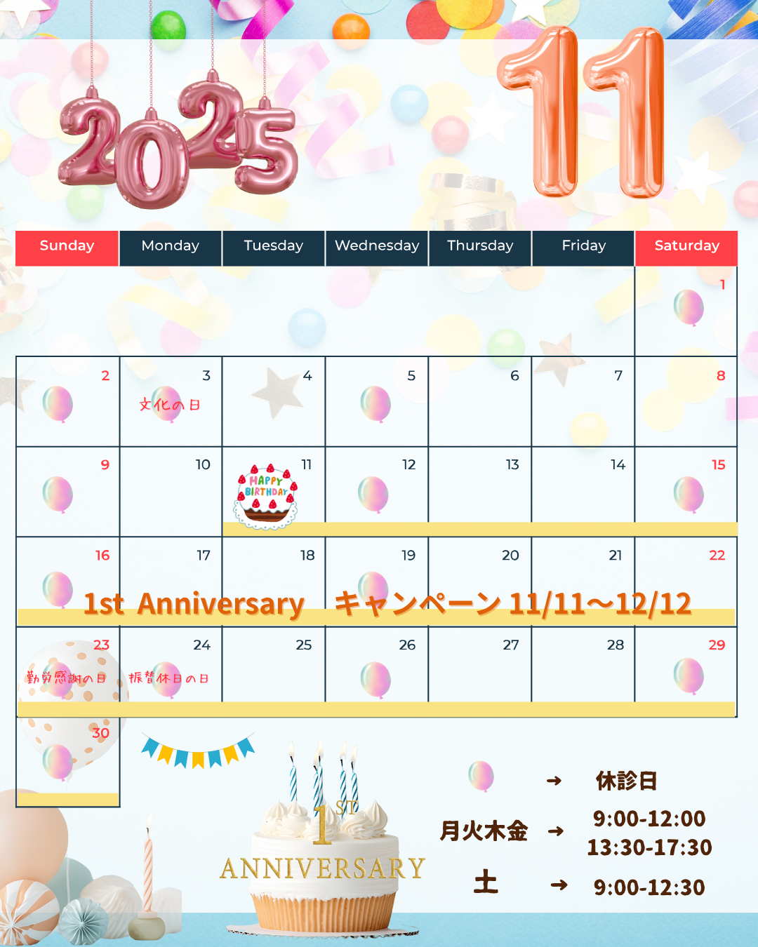 11月診療日 2025 10/16 こんにちは。 ネイチャーオーラクリニックです。 11月の診療日のお知らせです。 11月は開院一周年記念のキャンペーンも行いますので、この機会にどうぞご来院いただけたらと思います。(^^♪ ご予約の際はご確認のほど、よろしくお願いいたします。 TOPへ戻る 施術メニューを見る